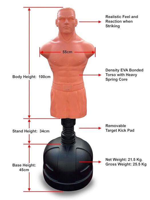 The Morgan XL Bob Freestanding Punching Bag is designed for realistic, targeted striking training across boxing, kickboxing and MMA. Featuring a full-size male torso profile and fixed height construction, this freestanding dummy allows athletes to train precision strikes, combinations and body targeting with confidence. Built from high-density EVA with a heavy-duty spring core, it delivers excellent shock absorption while remaining stable under repeated impact — making it ideal for both home and commercial training environments.